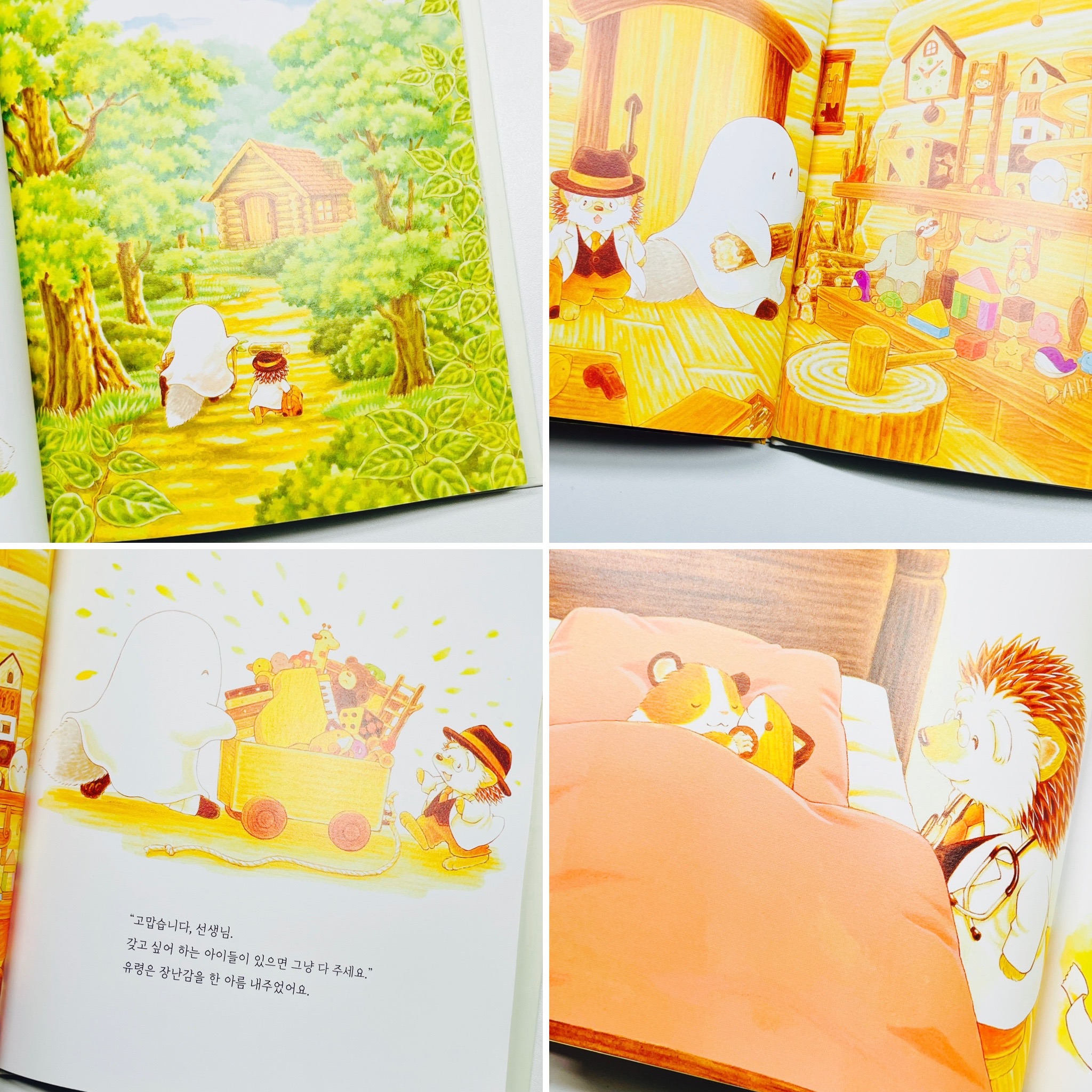 유령의 집 안 가득 놓인 나무 장난감 장면에서는 분위기가 확 달라집니다. 아이가 한 장면씩 짚으며 “이건 토끼야? 이건 자동차 같아!”라며 즐겁게 상상하더라고요. 유령이 망치로 만든 장난감이 병원으로 옮겨지고, 환자 동물들에게 전해지는 과정은 마치 또 다른 마음처방 같았습니다.