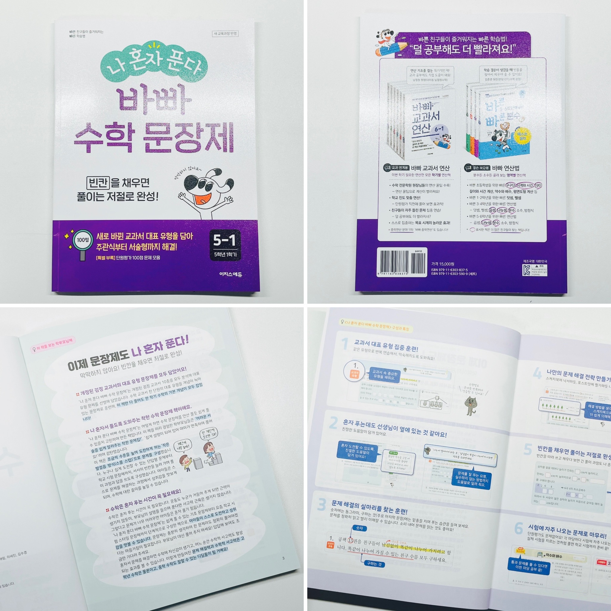 그래서 선택하게 된 교재가 이지스에듀의 :: 나혼자 푼다 바빠 수학 문장제 5-1 :: 이에요. 이름처럼 ‘혼자 푸는 힘’을 길러주는 데 초점이 맞춰져 있다는 점이 가장 마음에 들었어요. 단순히 문제를 많이 풀게 하는 방식이 아니라, 스스로 해결하는 과정을 만들어준다는 점에서 기존 문제집과는 방향이 다르다고 느껴졌어요.